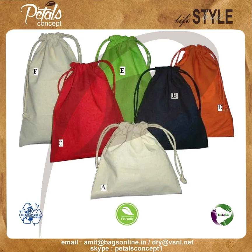 We have a wide category of bags for all purposes like Shopping bag , Tote bag , Calico bag , Grocery bag , Beach bag , Promotional bag , Reversible bag , Wine bag , Window bag , Drawstring bag , Jewelry pouch , Gift bag etc .