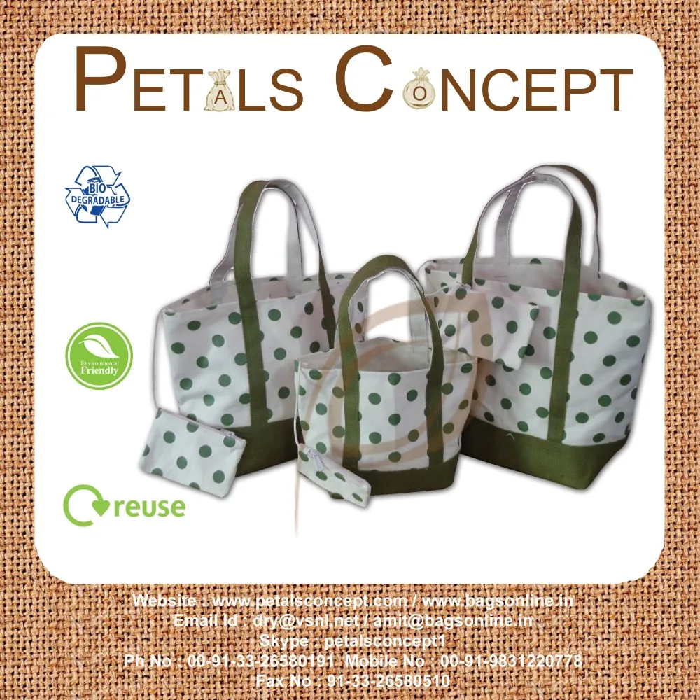 Our beautiful bags come in different shape , style , Size & design with variety of print like floral design , Animal texture print , landscape print , logo , Nature print , Stripe print etc with various option of Handle like Jute , cotton , web handle, Wooden handle ,Cane handle, Leather handle , Padded Rope handle , Bamboo handle etc & can be customize according to requirement.