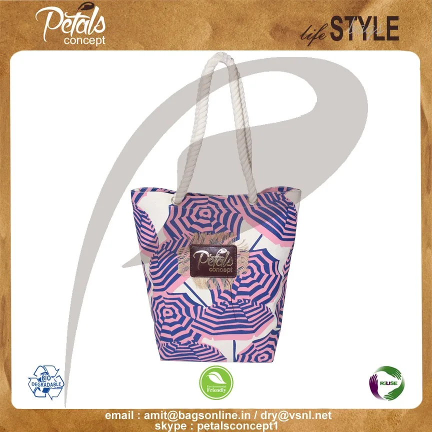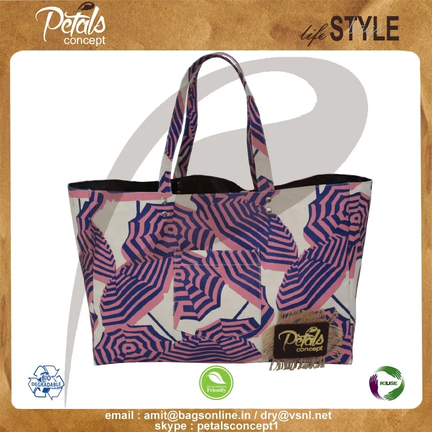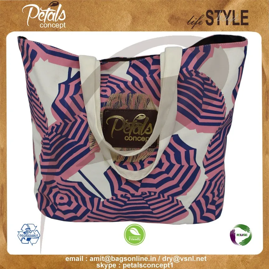 Our beautiful bags come in different shape , style , Size & design with variety of print like floral design , Animal texture print , landscape print , logo , Nature print , Stripe print etc with various option of Handle like Jute , cotton , web handle, Wooden handle ,Cane handle, Leather handle , Padded Rope handle , Bamboo handle etc & can be customize according to requirement.