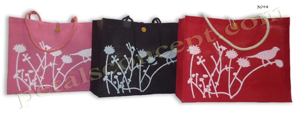 Our beautiful bags come in different shape , style , Size & design with variety of print like floral design , Animal texture print , landscape print , logo , Nature print , Stripe print etc with various option of Handle like Jute , cotton , web handle, Wooden handle ,Cane handle, Leather handle , Padded Rope handle , Bamboo handle etc & can be customize according to requirement.