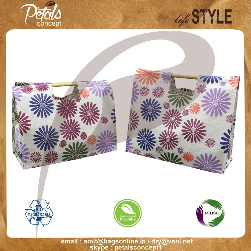 Our beautiful bags come in different shape , style , Size & design with variety of print like floral design , Animal texture print , landscape print , logo , Nature print , Stripe print etc with various option of Handle like Jute , cotton , web handle, Wooden handle ,Cane handle, Leather handle , Padded Rope handle , Bamboo handle etc & can be customize according to requirement.
