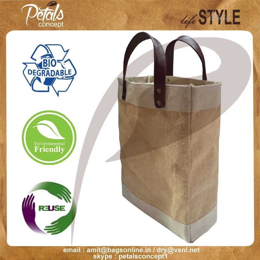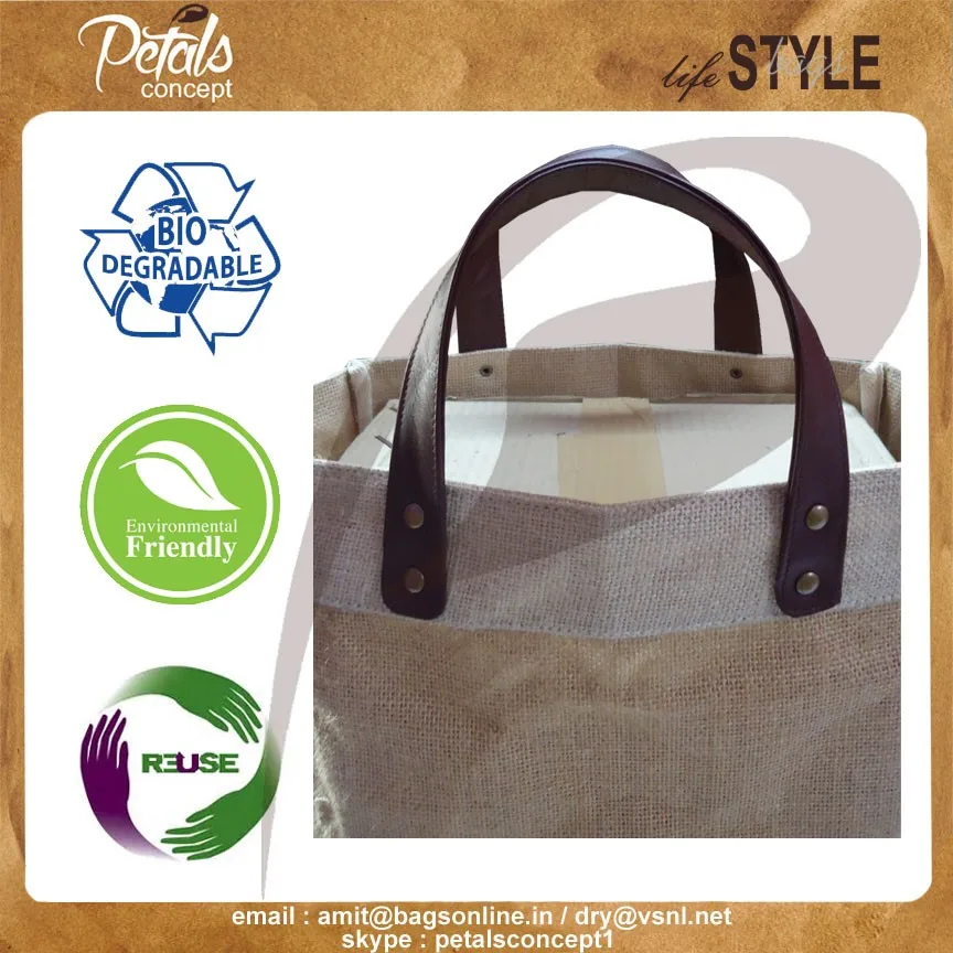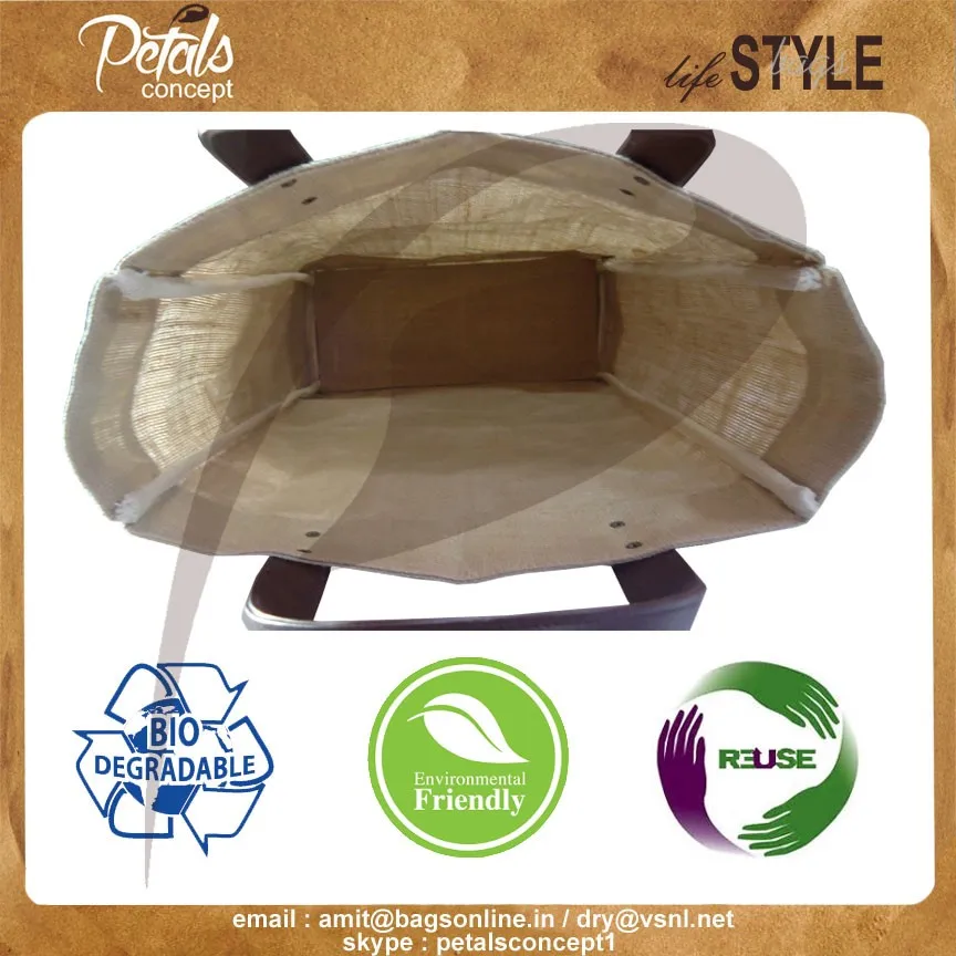 Leather Handle Jute Bag - With Removable Hard Base - Genuine Leather Handle - Luxary Bag