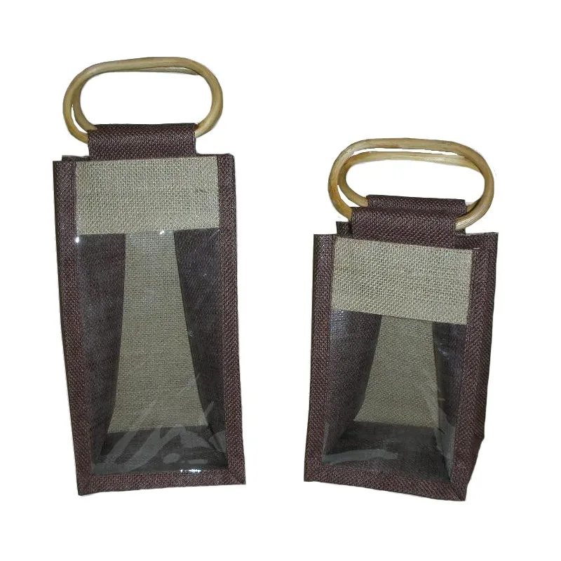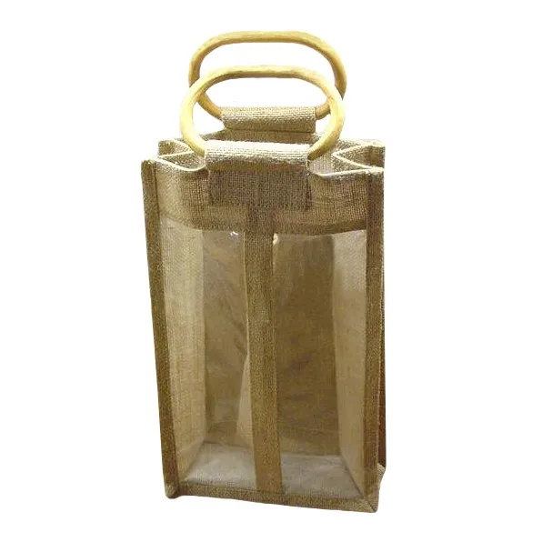 PP Laminated Jute Two Bottle Wine Bag With Window & With Wooden Cane Handle With Inside Partition