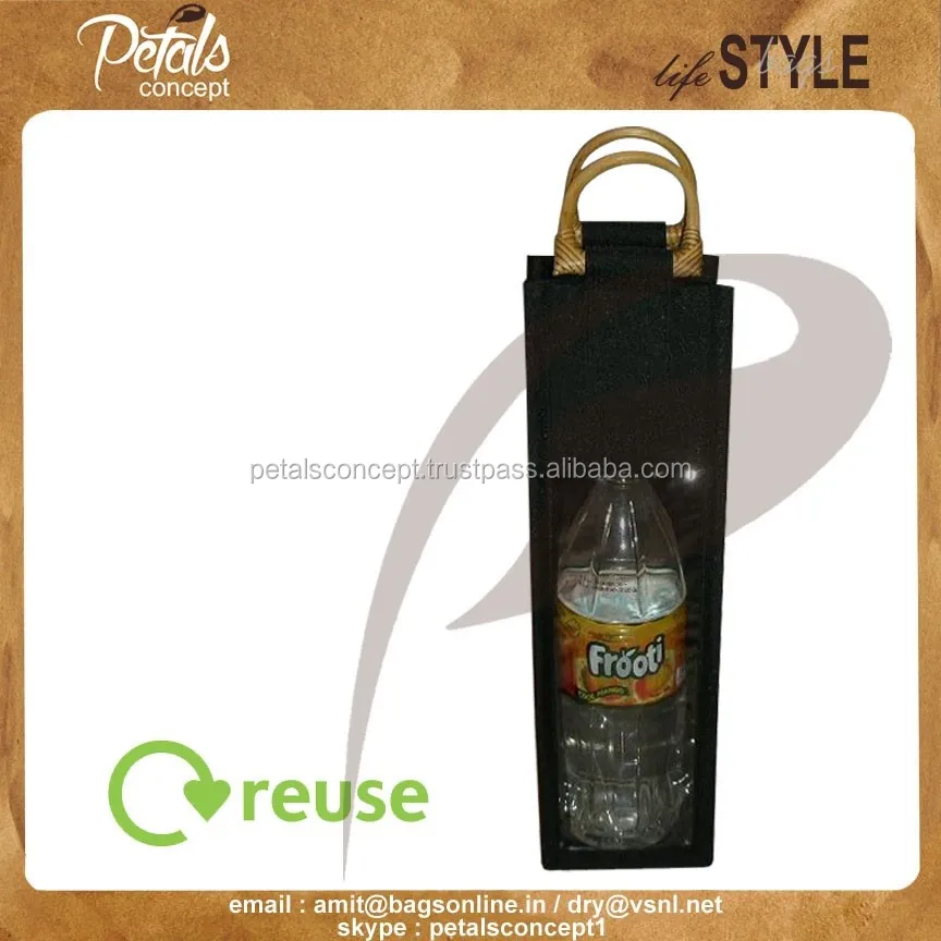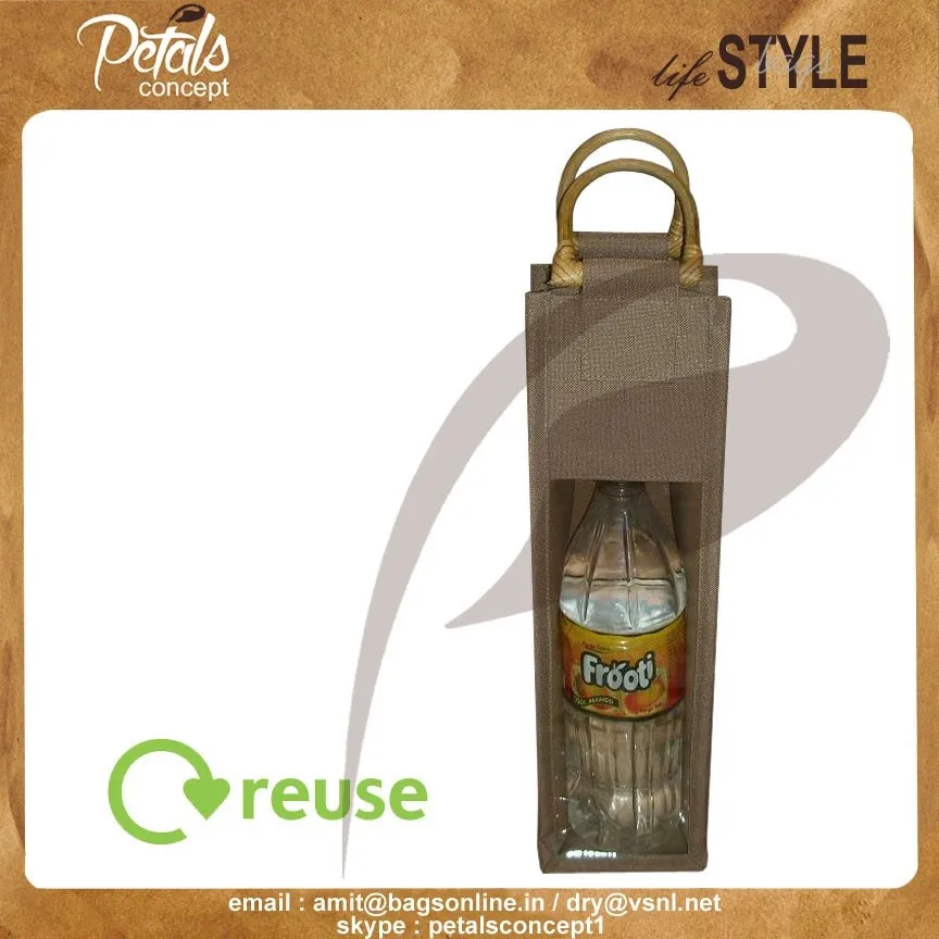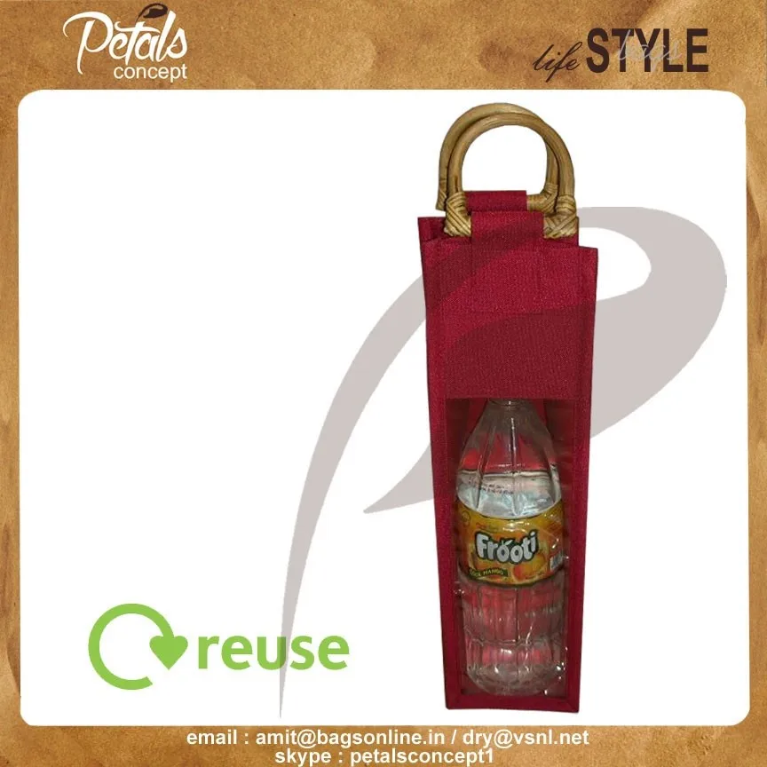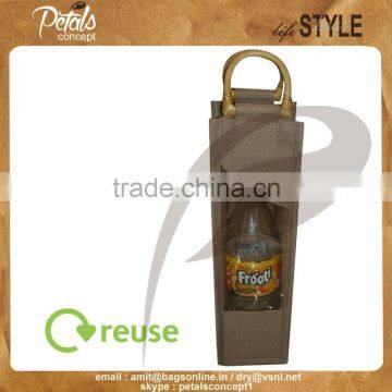 One bottle nylon fabric Wine bag with wooden cane handle & with front transparent window