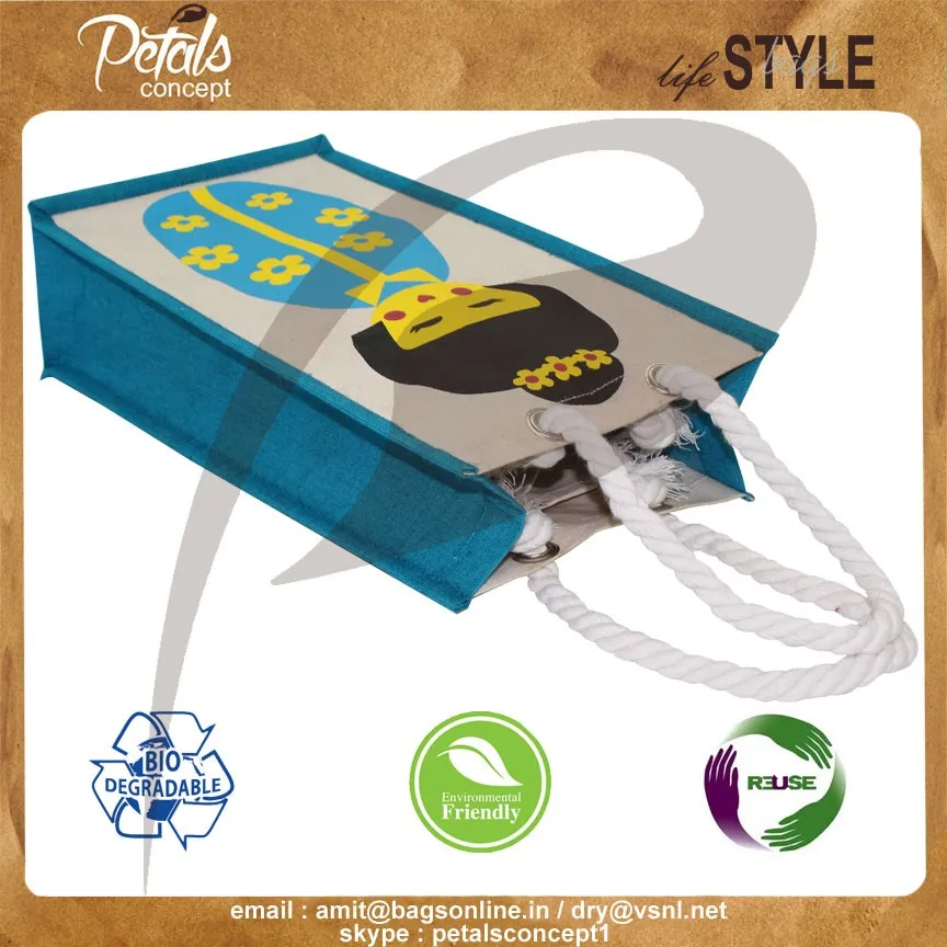 PP Laminated Jute Two Bottle Wine bag with Cotton Rope Handle & with inside bottle partition