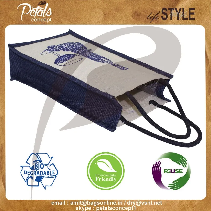 PP Laminated Jute Two Bottle Wine bag with Cotton Rope Handle & with inside bottle partition