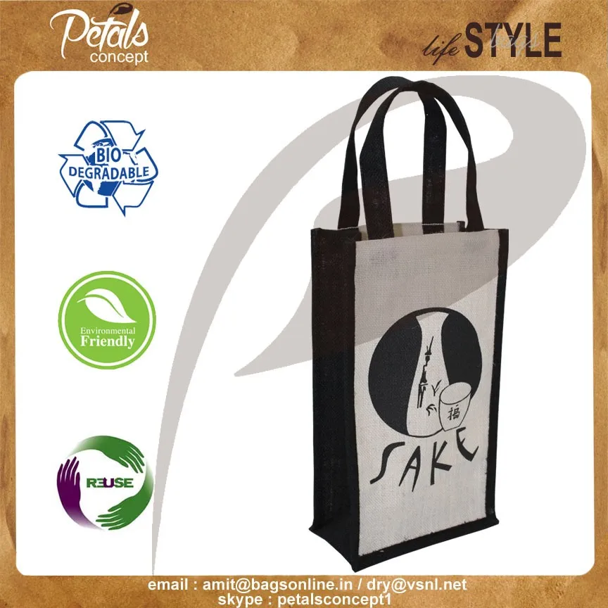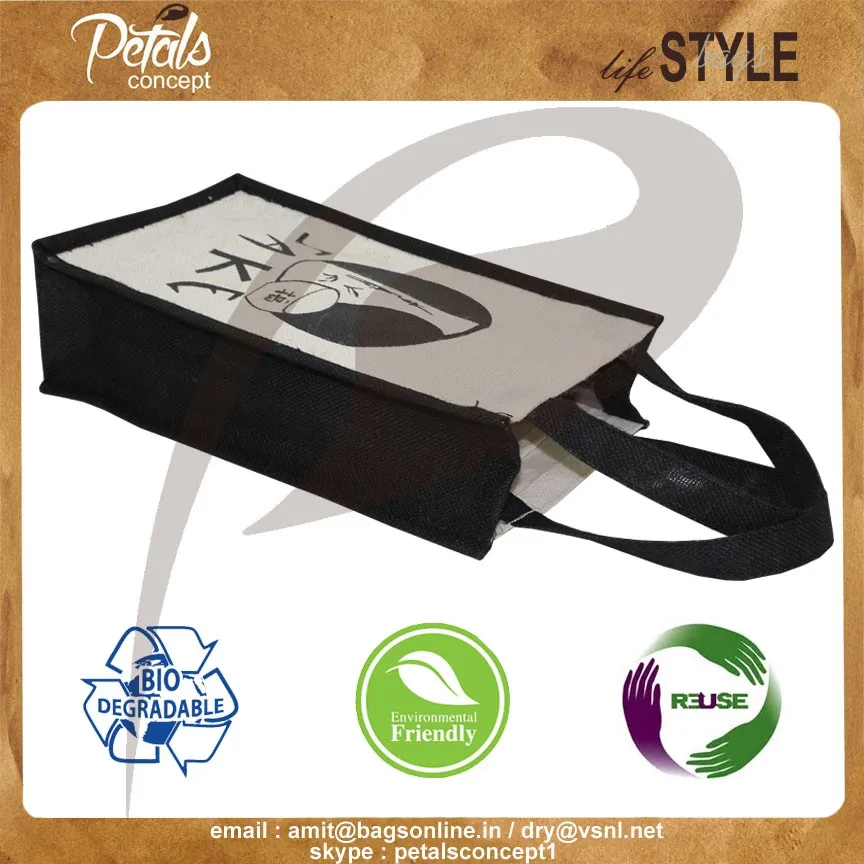 PP Laminated Jute Two Bottle Wine bag with Padded Rope Handle & with inside bottle partition