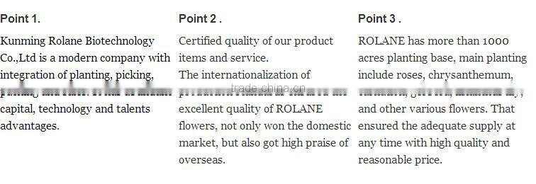 4) ROLANE has more than 1000 acres planting base, main planting include roses, chrysanthemum, carnation, gerbera, lisianthus lily, and other various flowers. That ensured the adequate supply at any time with high quality and most competitive price.