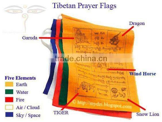 Prayer flagsreflect this comprehensive system through color; each of the 5 colors relates to an element and an aspect of an enlightened mind. The order of the colors in the flag is always the same: yellow, green, red, white and blue. In the vertical flags the yellow goes at the bottom and the blue at the top, and in the horizontal one´s the order, from left to right or from right to left does not matter.