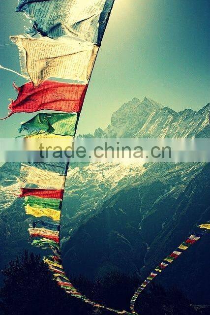Wandering pilgrims carry strings of flags with them to adorn the sacred sites that they visit and also as protection against harm when traveling. That is why also many Sherpa’s before climbing the Himalayas, put some flags, burn some incense and sing some mantras.