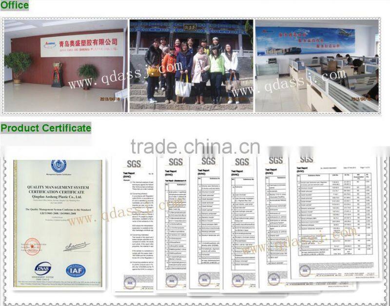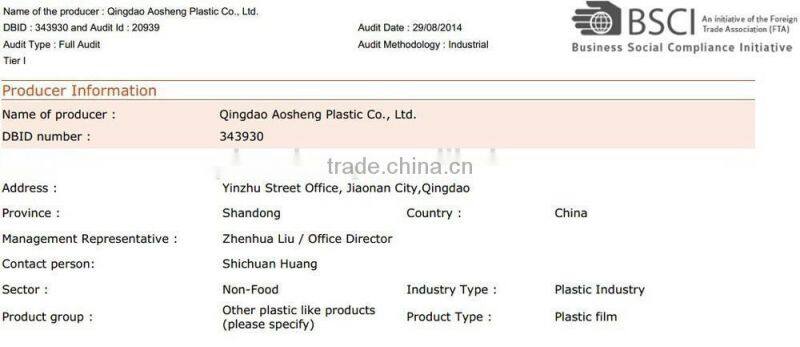 QINGDAO AOSHENG PLASTIC CO.,LTD is located in a beautiful coastal city, Huangdao district of Qingdao. The distance between AO SHENG and Qianwan port of Qingdao is only 20km, so traffic is very convenient.Our enterprise passed quality certification of “ISO9001”, and got”grade A star of import-export enterprise”from Qingdao custom. Company,with independent import and export power and rich experience in foreign trading, has more than 40 employees, including Technical personnel, business personnel, management personnelandproduction personnel, has 30 sets equipment, such as rolling film machine, blowing film machine and blowing-printing machine. Because we mainly operate importing raw material and processing business, the price is sure to be competitive among the market. Up to now, our products have be exported to Europe, USA, Russia, Japan, Austria, Spain, Mongolia and so on.