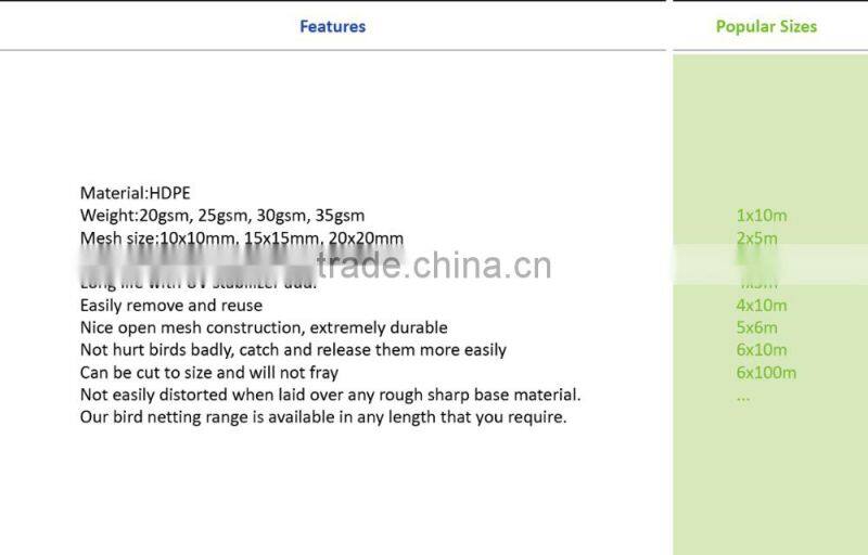 | Name | Plastic Mesh HDPE Knitted vineyard knotless bird proof net anti bird protection netting for vegetable with UV protection |