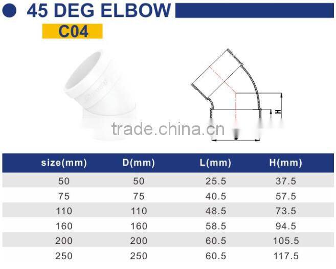 Factory price Manufacturer good quality PVC Fitting UPVC Rubber Joint plastic fitting for drainage GB 45 degree elbow