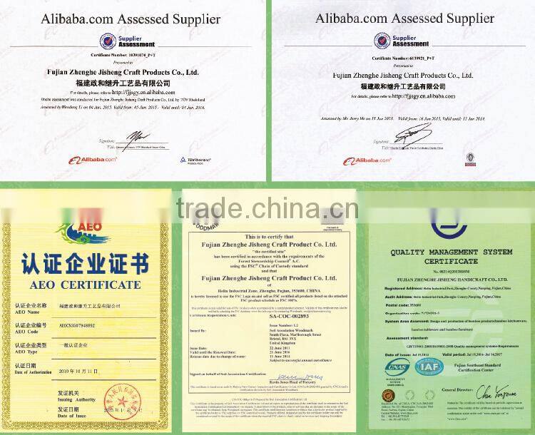 FUJIAN JISHENG CRAFT PRODUCTS CO.,LTD is located in the southeast of Wuyi Mountain in Zhenghe county of Fujian Province. It was established in 1989, the registered capital is over $8 million, posses over $9 million of enterprise assets with annual output over $13 million, covering the total area of 34,000 square meters, there are about 350 regular workers in our plant, we also establish a foreign trade branch in Fuzhou city. We have domestic advanced production equipment and technology, with sound management system. We have got the certification of ISO9001, ISO14000, TUV, BV, FSC, etc, and we have successfully reached the standard of many foreign professional audit firms and social responsibility audit. Our main products covering bamboo kitchenware series and furniture series, such as bamboo cutting board, bamboo flooring, bamboo tray, bamboo dinnerware, bamboo tea sets, bamboo flower stand and bamboo basin sets, all of these are made of natural old moso bamboo from high mountain, under many working process, with extractive craft and leading design, they are very popular in Europe, America, Southeast Asia and other countries due to unique, novel style. Customer first & Quality first is our principle. We sincerely welcome domestic and abroad clients to establish business relations with us! For more about us, please visit our website: www.fjjsgy.en.alibaba.com.