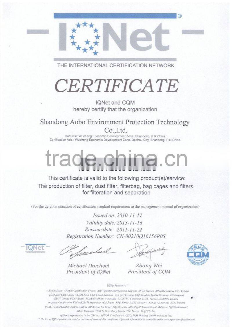 Shandong Aobo Environmental Protection Technology Co., Ltd., as a member unit of China Non-Woven Association and a member of China Bag Dust Association, is situated in Wucheng Economic Development Zone of Dezhou City, which was titled as "Reaching in all directions". Our company has a beautiful surrounding environment and convenient transportation. We are only three hours' drive away from Beijing and one hour away from Jinan. Our factory covers an area of 200 acres with office buildings, research rooms, product exhibition halls, dust filtering material workshops, air filter material workshop, and hard cotton thermal insulation material workshops. Our company has a world-class non-woven production line introduced from Germany, a needle-punched hot-air hot-melt production line and Japanese exclusive electromagnetic sewing bonding filter bag production lines. Our company has a professional filter & purification scientific research room together with a professional after-sales service team.