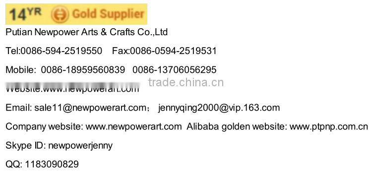 This is Putian Newpower Arts & Crafts Co.,Ltd from China. We are the moderinzed and industrialized factory located in Fujian and primarily focus on producing ,trading gifts & arts & crafts, any customized style and size as you prefered and requested. We passed BSCI certificate and closely work with many testing center like: SGS and Intertek.