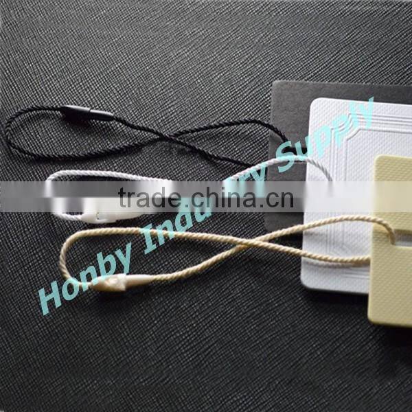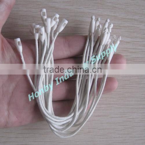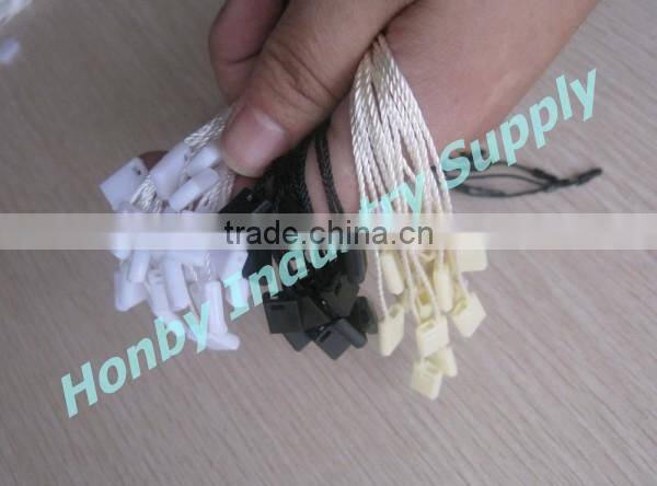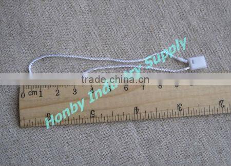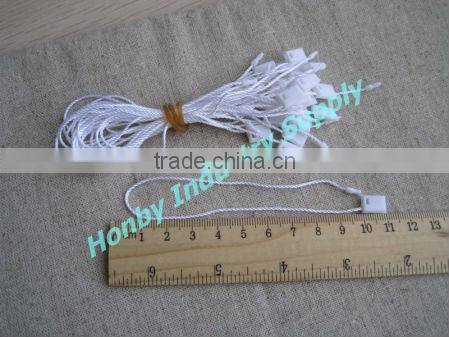 White hang tag plastic lock nylon string ideal for tag hanging of garment, clothing, underwear, skirt, toy,and more commodity tag use. Hot white color can go withing any type of garment.