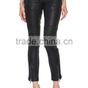A nice figure hugging leather Pant exclusively made. This design featured, Zipper accents around the waist. Embroidery stitching detail on knees. Zipper closer on hem. Leather Ribbed panels on side and back waist. Back zipper closer Pockets.