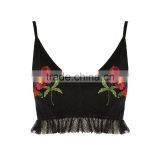 Wholesale Black Color V-Neckline Skinny Straps Lace Trim Floral Embroidered Sexy Crop Top