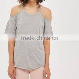 Wholesale Round Neck Cutout New Design Girls Cold Shoulder Marl Grey T-Shirts
