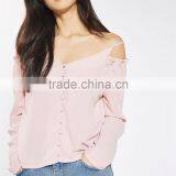 Ruffle Detail Long Sleeve Cold Shoulder Button Front Light Pink Blouse 100% Polyester