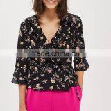 Ruffle Cuffs V-Neckline Flower Print Ruffle Wrap Top Ladies Tops Latest Design