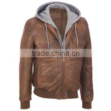 Beautiful fashion leather jacket, side zip functional Pockets, two flap pockets with snap-tab on chest, zip fastening, stand collar with snap-tab, removable hood and elegant ribbed cuff & Hem |