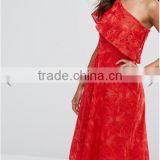 Guangzhou Clothing OEM Frill Detail Bright Red Floral Jacquard One Shoulder Dress