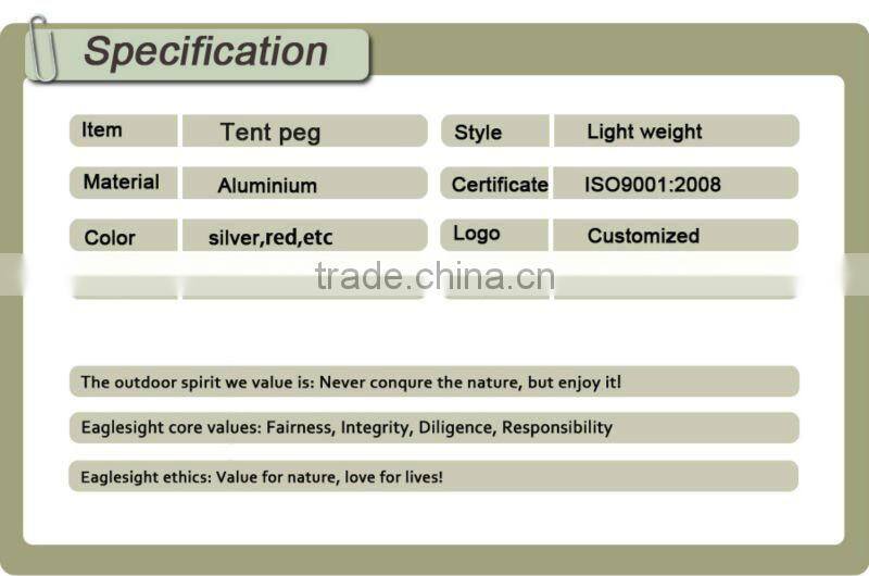 Item: tent stakeMaterial: Aluminum/Steel/Plastic