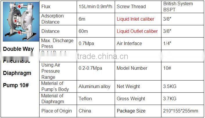 There are four materials in Pneumatic Diaphragm Pump: plastic, aluminum alloy, cast iron and stainless steel. The diaphragm pump will adopt different materials, such as Buna-N rubber, Chloroprene rubber, fluororubber, PTFE, according to the different liquid and to meet customers’ need. Place in all kinds of special occasion; use to pumping the medium which the general pump cannot do so. And it is gain a satisfied effect.