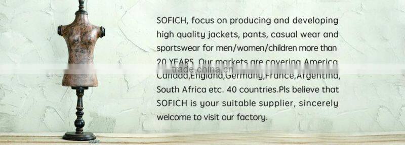 Our company was founded in 1992.We have been devoted to producing high and medium quality jackets, pants, casual wear and sportswear for men, women and children,with more than 1,500 staff members and an annual output amounting to 3 million pieces of clothing.We have got ISO9001 international qualification system certificate.Our main markets are European and American markets. Now our products cover more than 40 countries and regions,such as America,Canada,England,Germany,France,Argentina,South Africa and so on. We advocate the concept of "human oriented" management,centering in the cultivation and recruitment of talents.Now we owned the team of designers,quality controllers,purchasers,sewing workers and sellers,and also have using advanced CAD system of paper pattern machine and computerize management system on developing products. In order to sell our products effectively in the intensely competitive market,we set up our own office named SOFICH Industrial & Trading Co., Ltd. in Xiamen,which has the self import & export right.We also attend many exhibitions to develop more business,which including "Magic Show" in Las Vegas,"INTERMODA" in Mexico,"China Import and Export Fair"in Guangzhou,"East China Import and Export Fair" in Shanghai,"International Fashion Show" in Hong Kong etc,warmly welcome to visit our booths! With our hard working and our factory technician assistant,we have received highly appreciation from our customers.You are warmly welcome to visit our company and hold business talks with us.