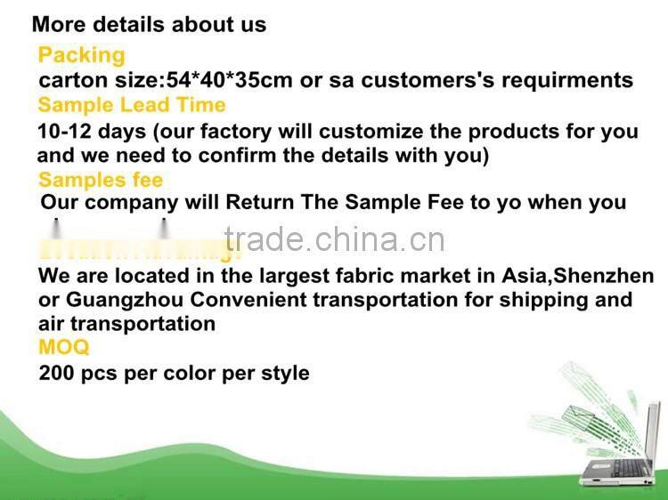 1) Excellent equipments( shrinke machine;computer sewing machine;strip cutting machine;twin needle machine;snap-fastener machine;button attaching machine etc)
