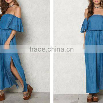 Blue Chambray Off Shoulder Bell Sleeve Maxi Denim Jeans Dress Ladies Western Dress Designs HSd5281