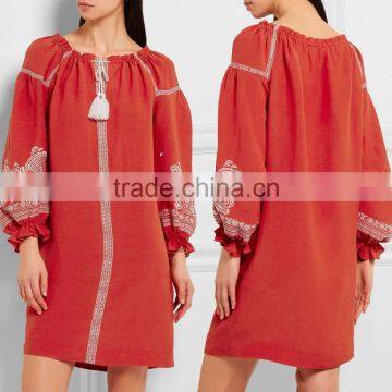 Product Description- Cool Bohemian Embroidered Slub Crepe Linen Mini Dress Hand Flora Embroidery Designs 2016 HSD5750