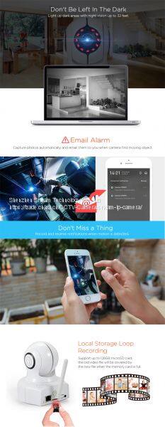 | Features: 1: P2P, PnP: Plug and Play. No need DDNS. No need Port Forwarding setup. 2: Sricam App: Supports iOS, and Android smart phones or tablet PCs for remote monitoring. 3: Onvif Protocol: Supports NVR real time monitoring, recording and playback. 4: MicroSD Card: Supports up to 128GB microSD card for recording and playback. 5: Alarm: Supports Motion detection alarm, Phone push alarm, Email alarm and Whistle alarm. |