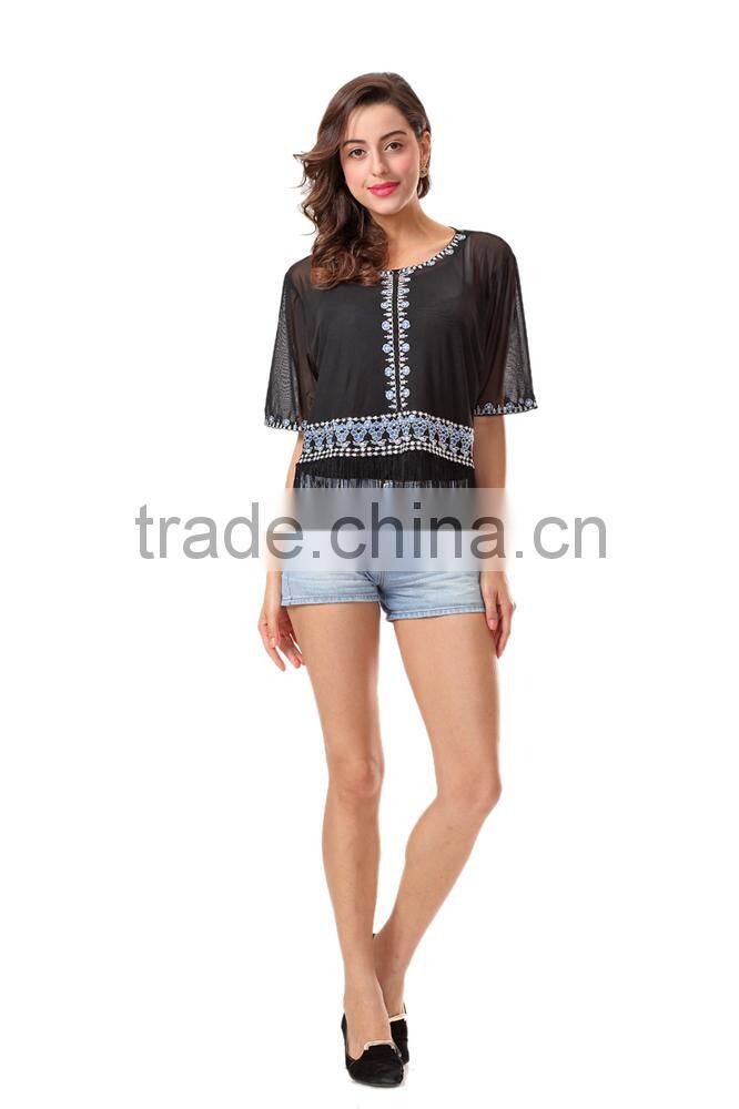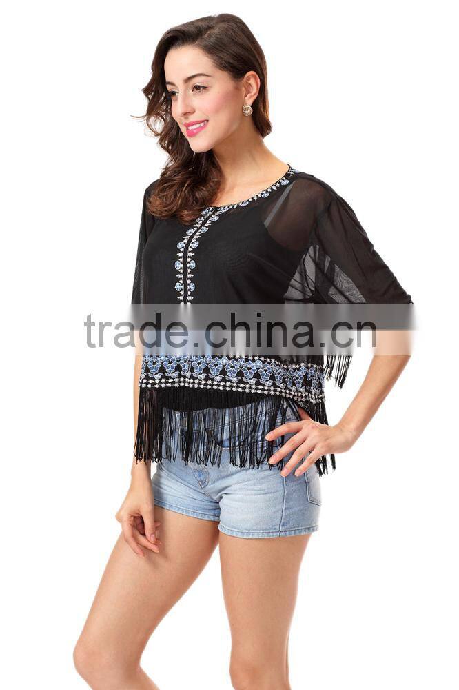 New Fashion Short Sleeve Embroidery Tassel Women Top