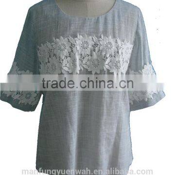 Korean Style Floral Lace Round Neck 3/4 Sleeve Linen Cotton Blouse