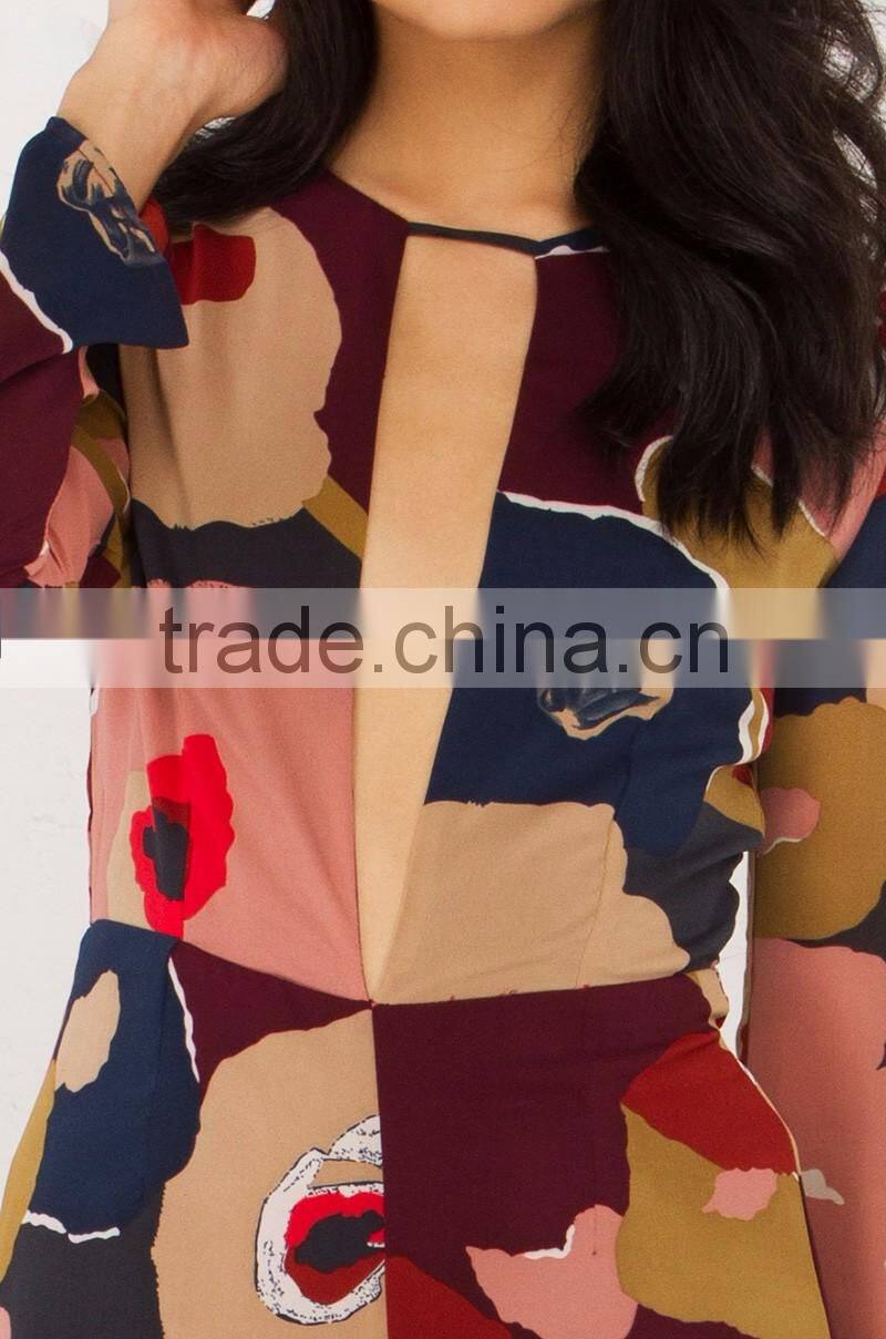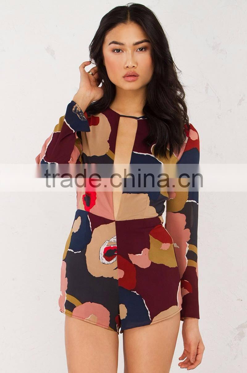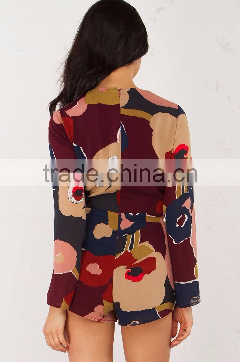 Printing Long Sleeve V Neck Playsuit Jumpsuits for Women 2016 Sexy