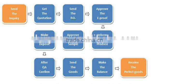 In the middle production,we will send photos in which you can see your products and confirm the estimated delivery time again.You can also arrange the third party inspection.Order can be say “Finish” when you receive the goods and satisfy with our customers.