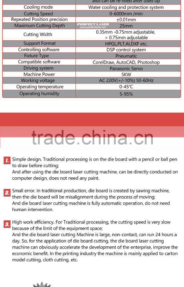 Die board Laser Cutting Machine designed by Perfect Laser is specialized in cutting die board up to 25mm, with high efficiency, excellent quality, low maintenance and low running cost, widely applicable for packaging, advertising Industry.