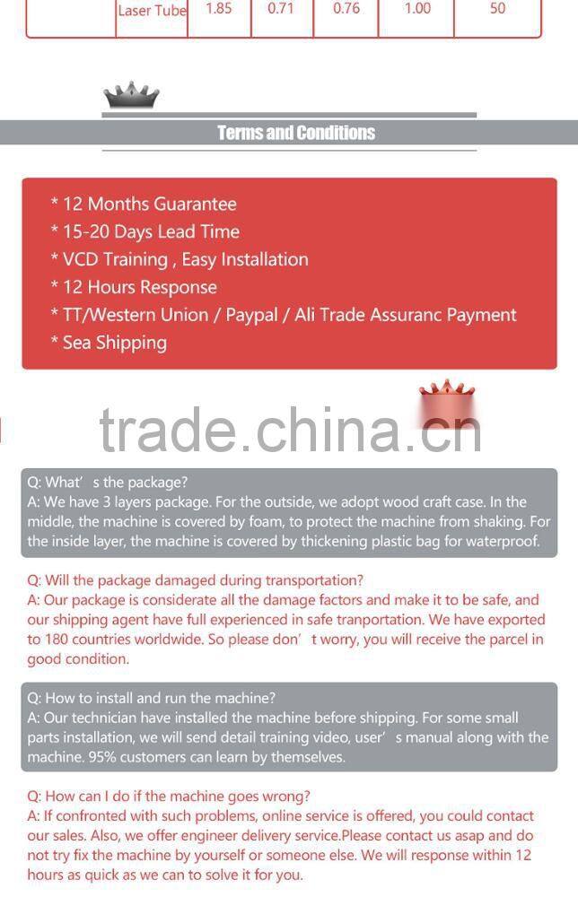 2. Install 2pcs Chinese Top Quality 150W CO2 laser tube, the watt is 1/10 of larger power cutting machine, low power consumption.