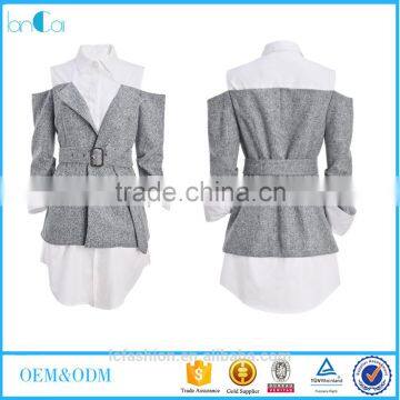 2017 new design cold shoulder long sleeve fake 2 piece shirt