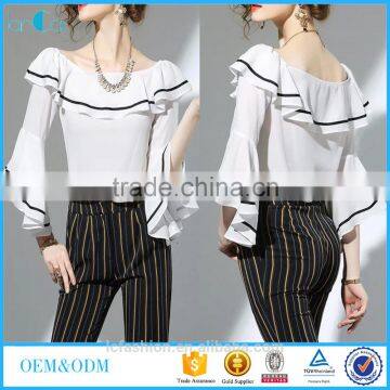 2017 wholesale summer women big round neck ruffle sleeve fashion chiffon blouse