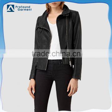 Fashion double buckle high collar asmmetric zip fastening faux leather winter biker jacket women