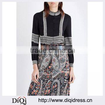 Wholesale Women High Neck Long Sleeves Buttoned Cuffs Geometric Embroidery Crepe Shirt(DQE0163T)