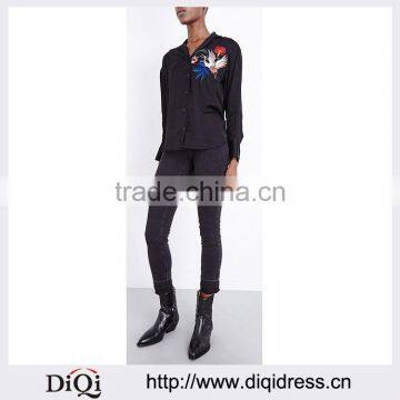 | Product Name | Wholesale Women Black Long Sleeves Hoxton Bird Embroidered Satin Shirt(DQE0108T) |