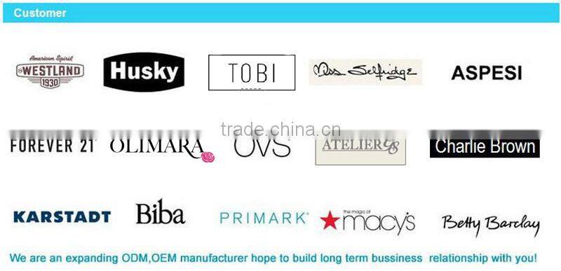 Main customers: Marices( USA),Christina (France), OVS (Italy), Malvin, Betty Barclay (Germany), Rare Fashion (UK), Westland(Russia),Kersh (Canada), Charlie Brown (Australia) etc.