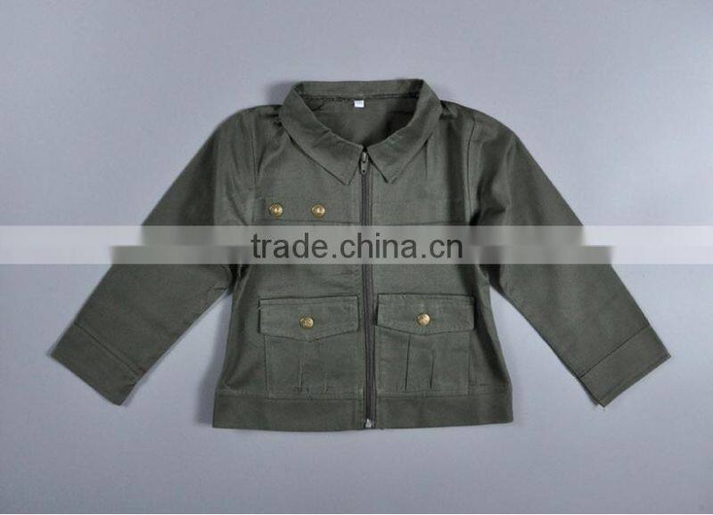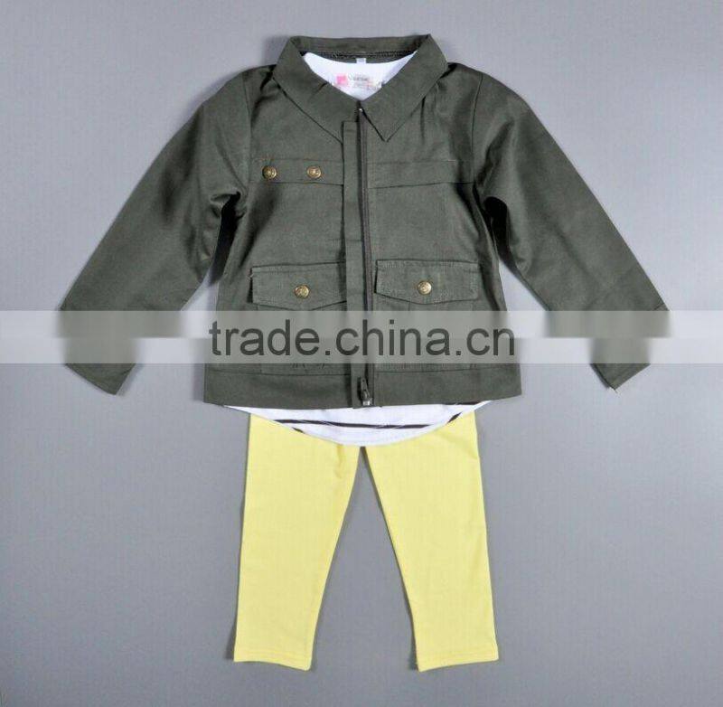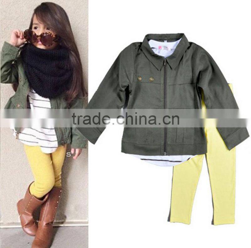 Wholesale Children clothing army green jacket stripe tee shirt and yellow pants 3 pieces sets