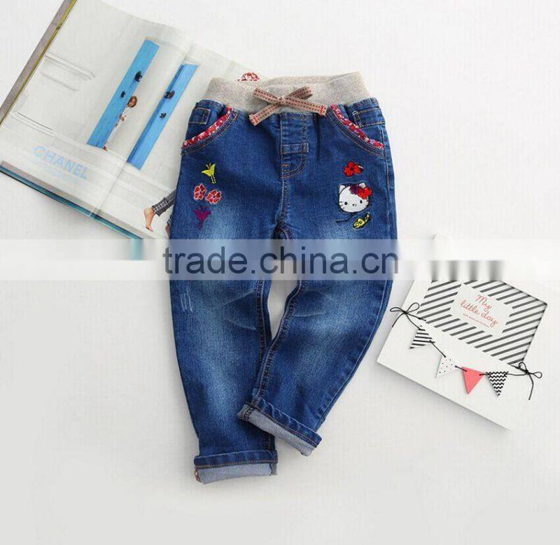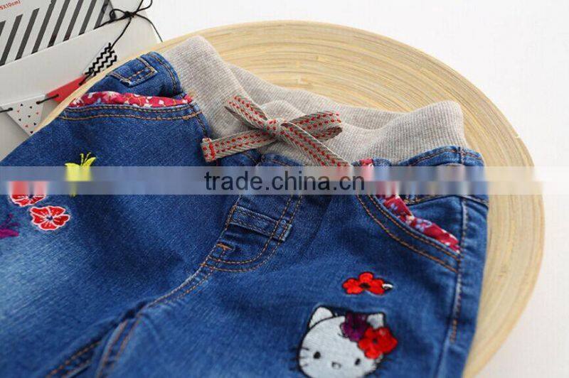 Cartoon cat casual denim trousers embroidered flowers for chid girl