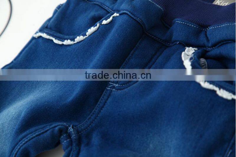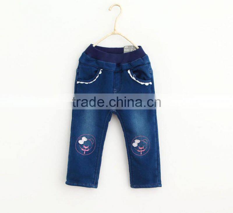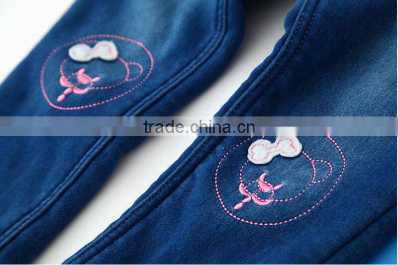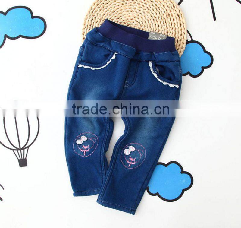 New fall children wear cartoon bear embroidered lace and cotton denim trousers